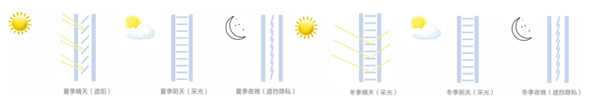 智能,是一种具备感知外部环境,分析判断外部环境,并根据分析判断结果自行做出改变的行为方式。中置遮阳能够感知太阳光强度,并跟随太阳光位置调整百叶角度,达到遮阳、采光和遮挡隐私的目的。原理如下: